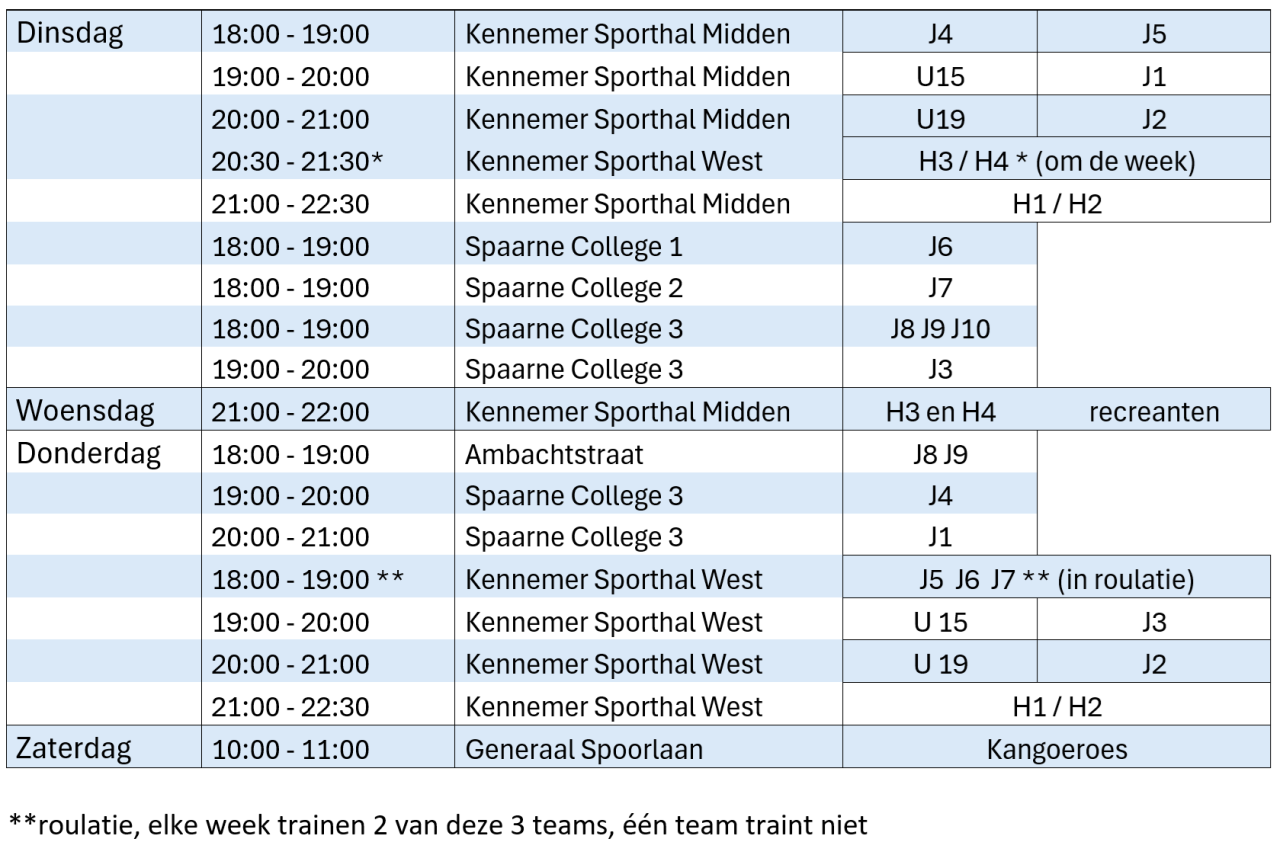 Voor wat betreft de zaal: de eerste zaalwedstrijden zijn op zaterdag 8 november. Tijden en tegenstanders worden bekend gemaakt in de KNKV-app, de trainingstijden en locaties staan in de tabel hieronder (en onder Club info > Trainingstijden – red.).